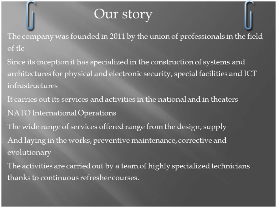We design and install low and medium voltage systems, photovoltaic street lighting, solar multimedia information panels for tourist locations, backup units with ups and generators, automatic exchange panels, remote control, home automation.